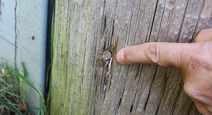 A pole that has rotted from the inside out and is tagged for replacement.